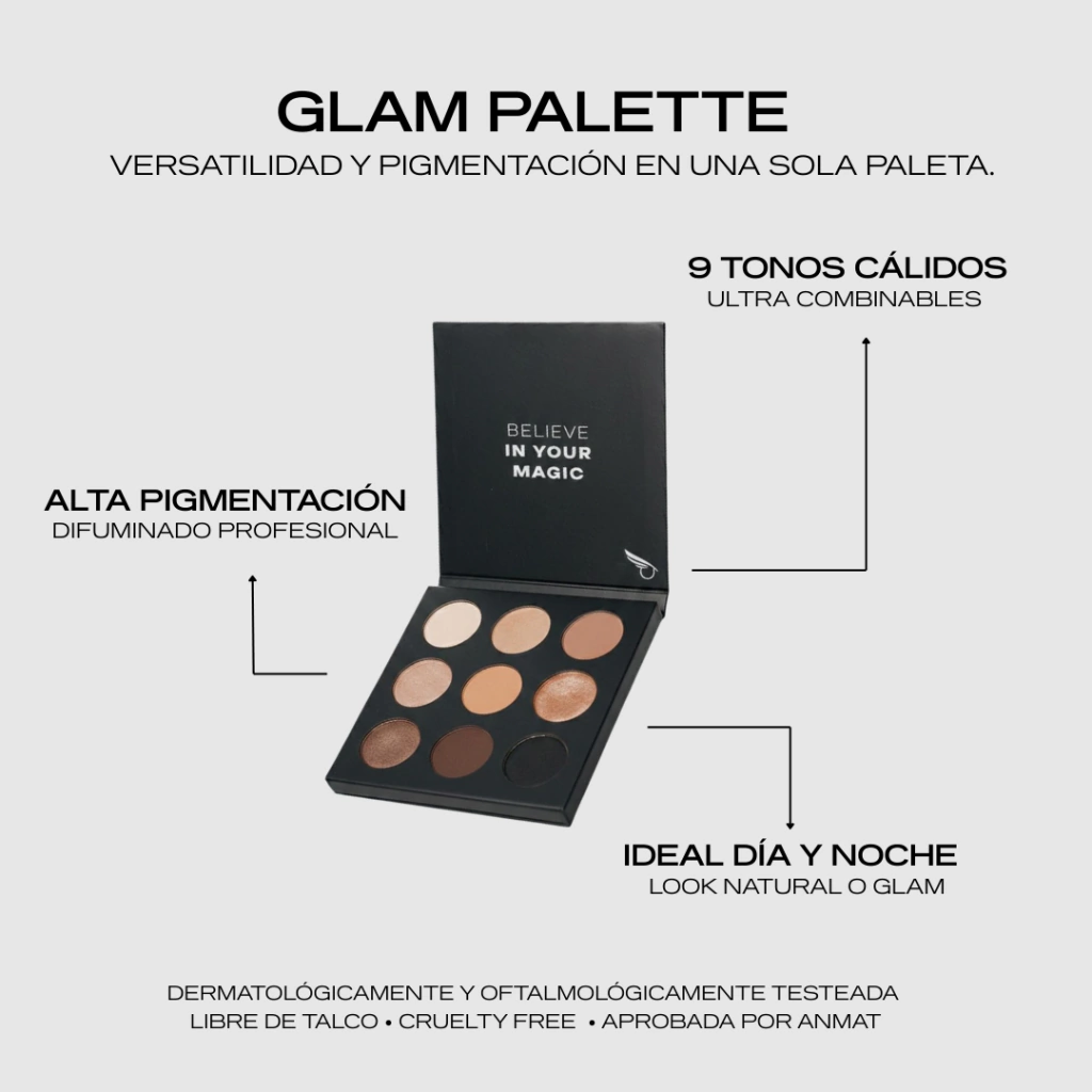 Paleta de 9 tonos cálidos y tierra con acabados mate, satinados y semisatinados. Alta pigmentación, excelente adherencia y difuminado fácil para crear looks versátiles.